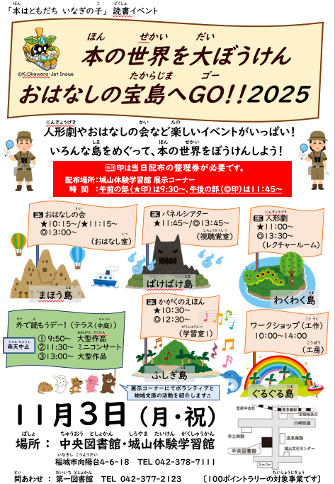 城山体験学習館と中央図書館が、この日はおはなしの宝島に!