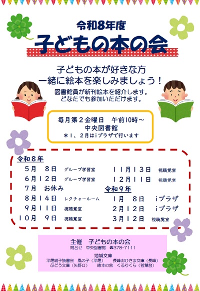 •主催 子どもの本の会 •後援 稲城市立図書館 •お問合せ 稲城市立中央図書館 042-378-7111