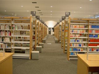大きく広がる空間に、約10万冊規模の書架と個人席・集合席合わせて約100席の閲覧席があります。