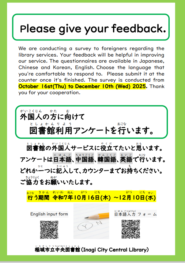 We are conducting a survey to foreigners regarding the library services. Your feedback will be helpful in improving our service.The questionnairesare available in Japanese, Chinese and Korean, English.Choose the language that you're comfortable to respond to. Please submit it at the counter once it's finished.The survey is conducted from October16st(Thu) to December10th (Wed) 2025. Thank you for your cooperation.