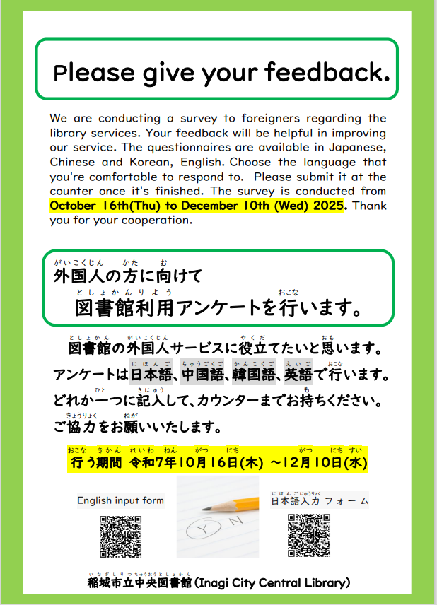 We are conducting a survey to foreigners regarding the library services. Your feedback will be helpful in improving our service.The questionnairesare available in Japanese, Chinese and Korean, English.Choose the language that you're comfortable to respond to. Please submit it at the counter once it's finished.The survey is conducted from October16th(Thu) to December10th (Wed) 2025. Thank you for your cooperation.