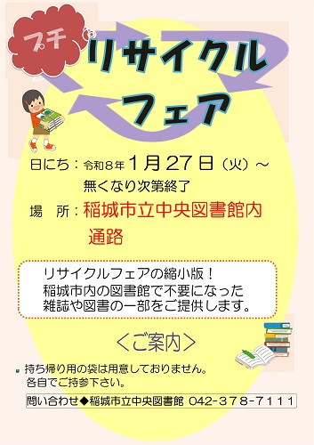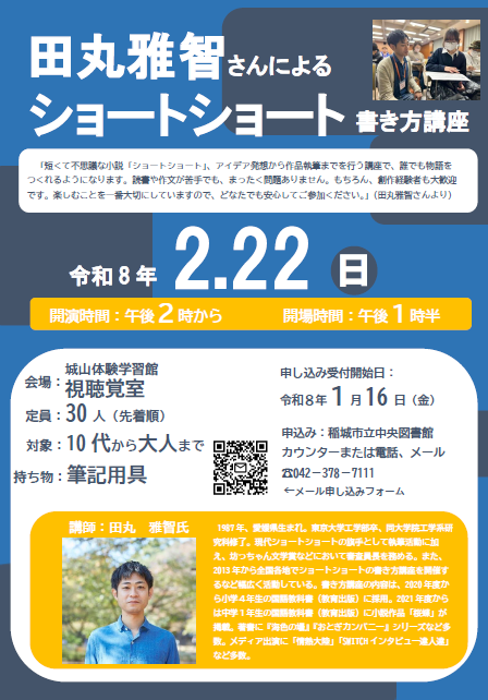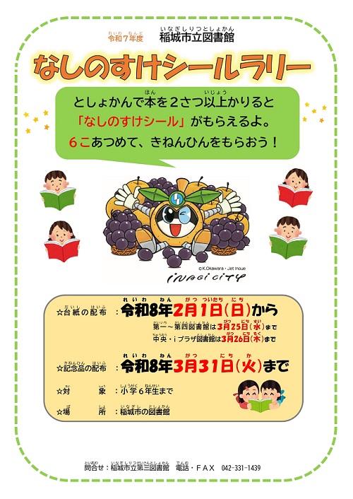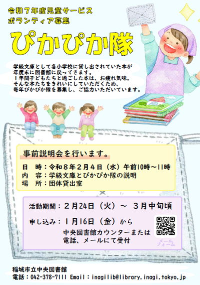 令和7年度児童サービスボランティア募集 ぴかぴか隊 学級文庫として市内各小学校に貸し出されていた 本が、年度末に図書館に戻ってきます。 1年間子どもたちと過ごしてき本を、また次の年 新しい子どもたちのところへ送り出すために、 毎年、ぴかぴか隊を募集してご協力いただいています。 おかげさまで、本も子どもたちも大喜びです。 今年も皆さんのご協力をよろしくお願いします。 事前説明会 2月4日(水)午前10時~11時 内容:学級文庫・ぴかぴか隊の説明など 場所:稲城市立中央図書館 団体貸出室 活動期間 2月24日(火)~3月中旬頃 申し込み:1月16日(金)から 中央図書館カウンターまたは電話、メールにて受付 電話番号 042-378-7111 メールアドレス inagilib@library.inagi.tokyo.jp