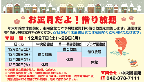 年末年始の休館前に、市内全館で本や視聴覚資料の借り放題を実施します。