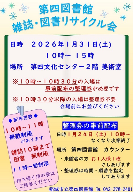 【中央】ハッピーマンデー借り放題 中央図書館の第二月曜日は… 図書や視聴覚資料が借り放題になります どなたさまも決して遠慮はありません たっぷり読書をお楽しみください 下記開催日は貸出冊数に制限はありません ▽開催日 ・4月14日 ・5月12日 ・6月9日 ・7月14日 ・8月11日 ・9月8日 ・10月13日 ・11月10日 ・12月8日 ・1月12日 ・2月9日 ・3月9日 ※予約点数は変わりません(図書10冊・視聴覚資料2点) ※貸出期間は平常通り2週間です ※上記以外の日は、平常の貸出点数に戻ります ※持ち帰り用の袋は用意しておりません。各自でご持参ください ※本イベント終了後に合計12点以上お借りの方は、返却後に新規貸出可能となります 問合せ:稲城市立中央図書館(電話:042-378-7111)