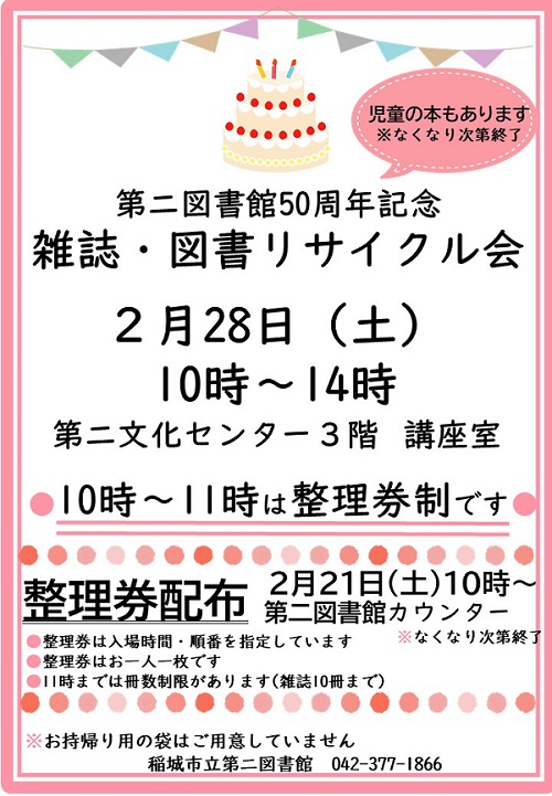 ▽整理券 2月21日(土)午前10時から第二図書館カウンタ―にて配布