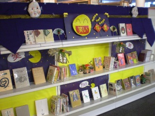 図書館の特集コーナーでは「笑い」を中心に集めた本を展示しています。