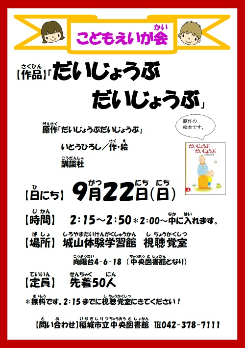 期日:9月22日(日) 時間:午後2:00~3:00(上映時間 30分) 場所:城山体験学習館 視聴覚室 対象:児童および保護者 先着50人 上映作品:DVD「だいじょうぶだいじょうぶ」など 約30分 いとうひろし/作・絵 講談社