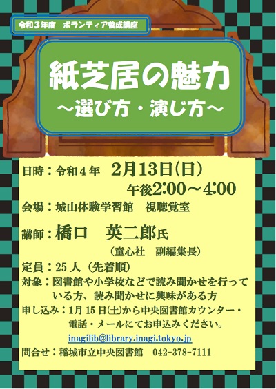 ボランティア養成講座 紙芝居の魅力 選び方、演じ方など、紙芝居の魅力を教えていただきます。日時:令和4年 2月13日(日) 午後2:00~4:00会場:城山体験学習館 視聴覚室(中央図書館隣接)講師:橋口 英二郎 氏定員:25人(先着順)対象:図書館や小学校などで読み聞かせを行っている方、読み聞かせに興味がある方申し込み:1月15日(土)から中央図書館カウンター・電話・メールにてお申込みください。問合せ:稲城市立中央図書館 ☎042-378-7111 ✉inagilib@library.inagi.tokyo.jp