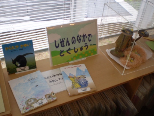 ブックリスト「よむゾウ」No.48、「よむよむ島」No.17で紹介した本も展示しています。