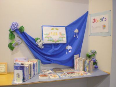 2014年6月「雨の季節」場所:一般展示コーナー ◆体験学習館側の入り口入って右◆ 6月は梅雨の季節。 そこで今月は「雨」をテーマに、 雨や雲、台風など天候や気象に関する本や、 雨をテーマ・題材として描かれた読み物、 また雨の日に向く遊びの本などを集めました。  |