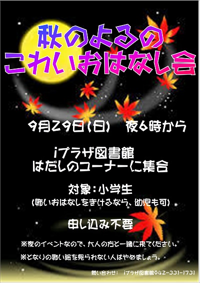 【iプラザ】あきのよるのこわいおはなし会毎年人気のこわいおはなし会を、今回は秋の夜に開催します。図書館に集合したあとは、階段を降りた先のひみつの部屋へ行き、こわいおはなしを楽しみます。