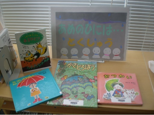 恵みの雨。癒しの雨。 でも図書館にとっては大事な本がしっとりしてしまう、 ちょっと困りものの季節がやってきました。 貸出や返却の時には、本が濡れないように気をつけて下さいね☆ ただいま児童コーナーでは、 よむゾウNo.58で紹介している「雨の日には」特集の本や 「ぼくのわたしのオススメの本」ランキング結果の本を展示しています。 涼しげなアジサイが目印です☆ぜひぜひ、ご覧下さい☆