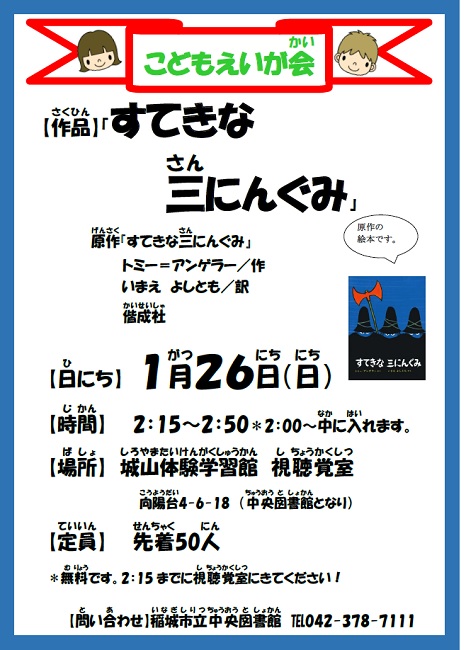 | | 2019/12/15 | (終了)【中央】こども映画会「すてきな三にんぐみ」ほか | | by 図書館管理者 |