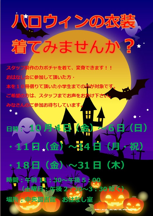 衣装は、カボチャの衣装と黒のマントがありますよ。 写真に撮ってみませんか 期間:10月4日(金)~6日(日)、 11日(金)~14日(月・祝) 18日(金)~31日(木) 時間:午前11:30~午後5:00 (土曜日午後2:30~午後3:30除く) 場所:中央図書館 おはなし室