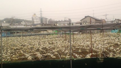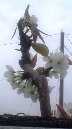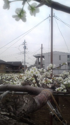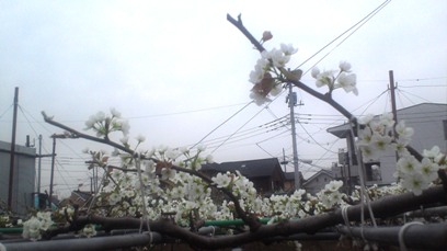 甘くておいしい実がなるのはまだ先ですが、この時期には、梨の白い花が