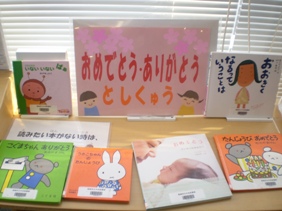 道ばたで、青いちいさなオオイヌノフグリが咲いているのを見つけました。 春だよ~!と、いっせいに叫んでいるようです。 新しい季節がやってきました! 今月の児童コーナーは、春の飾りつけでいっぱいです。 また、よむゾウNo.56で紹介している「おめでとう ありがとうの本」の展示も行なっています。 よむよむ島で載せている本もありますので、ぜひ見に来て下さいね♪