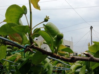 稲城市内の梨畑では、地元の名産品である梨の小さな実が