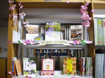 中央図書館の地域コーナーでは、「多摩 食べ歩き・さんぽ特集」の展示を