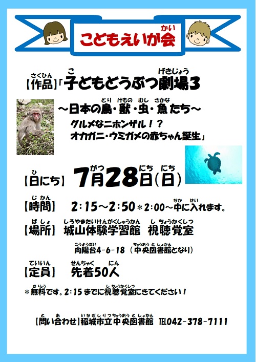 期日:7月28日(日) ※今年度から、奇数月:第四日曜に変更しております。 お間違えの無いようご注意下さい。 時間:午後2:00~2:50(上映時間 27分) ※上映開始時間は、2:15~ 場所:城山体験学習館 視聴覚室 対象:児童および保護者 先着50人
