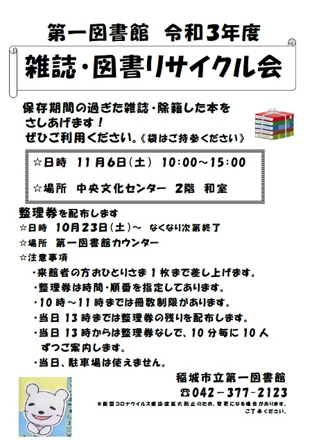 | | 2021/10/15 | (終了)【第一】雑誌・図書リサイクル会 | | by 図書館管理者 |