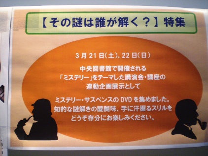 3月21日(土)、22日(日) 中央図書館で開催される 「ミステリー」をテーマにした講演会・講座の 連動企画展示として ミステリー・サスペンスのDVDを集めました。 知的な謎解きの醍醐味、手に汗握るスリルを どうぞ存分にお楽しみください。  |