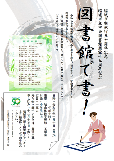 稲城市制施行50周年記念 稲城市立中央図書館開館15周年記念 図書館で書! 令和3年度稲城市制施行50周年を迎え、稲城市では 記念事業として、稲城市歌を作成しました。 新しい稲城市歌の歌詞を、筆ペンや毛筆で書いてみませんか? どなたでもご参加いただけます。