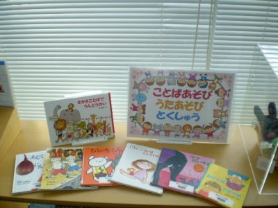 『ことばあそび・うたあそびの本』をテーマにかざりつけを行ないます。